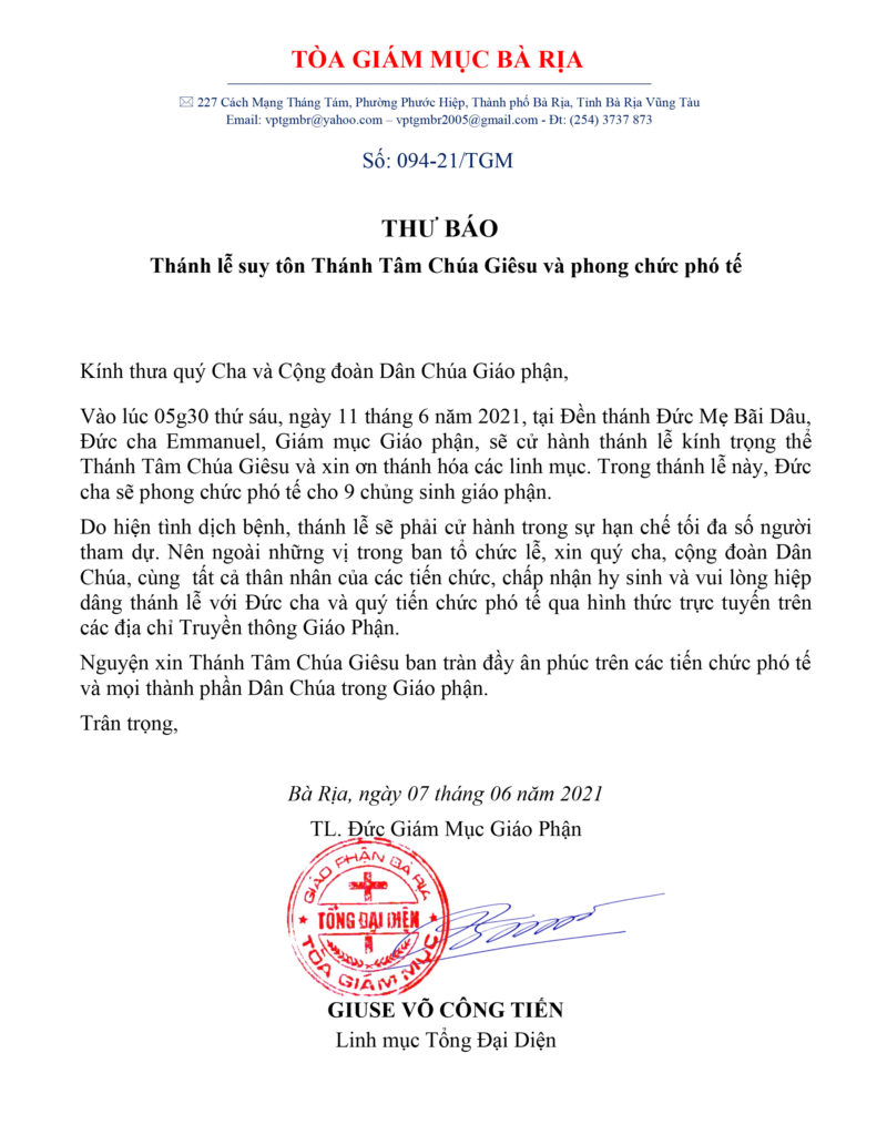 Do hiện tình dịch bệnh, thánh lễ sẽ phải cử hành trong sự hạn chế tối đa số người tham dự. Nên ngoài những vị trong ban tổ chức lễ, xin quý cha, cộng đoàn Dân Chúa, cùng tất cả thân nhân của các tiến chức, chấp nhận hy sinh và vui lòng hiệp dâng thánh lễ với Đức cha và quý tiến chức phó tế qua hình thức trực tuyến trên các địa chỉ Truyền thông Giáo Phận.