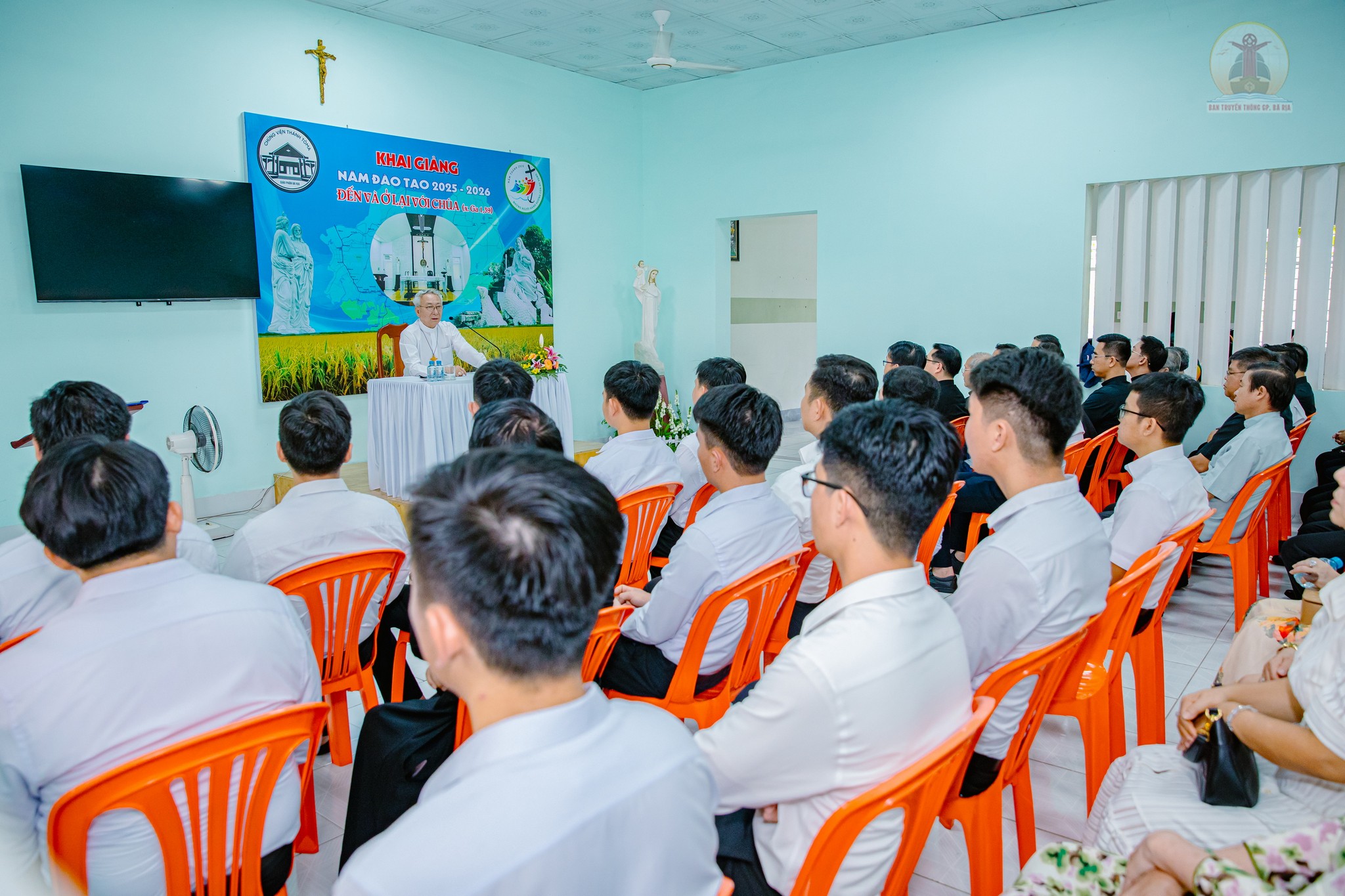 Sau giây phút đón tiếp, chương trình khai giảng bắt đầu lúc 09g00 trong bầu khí trang nghiêm. Mở đầu bằng lời cầu xin ơn thánh hóa, cộng đoàn nài xin Chúa Thánh Thần tuôn đổ muôn ơn lành trên năm học mới. Tiếp đó, Cha Giám đốc Phêrô đã trình bày định hướng cho chương trình đào tạo, giúp các tu sinh ý thức rõ con đường mình bước đi trong hành trình ơn gọi.
