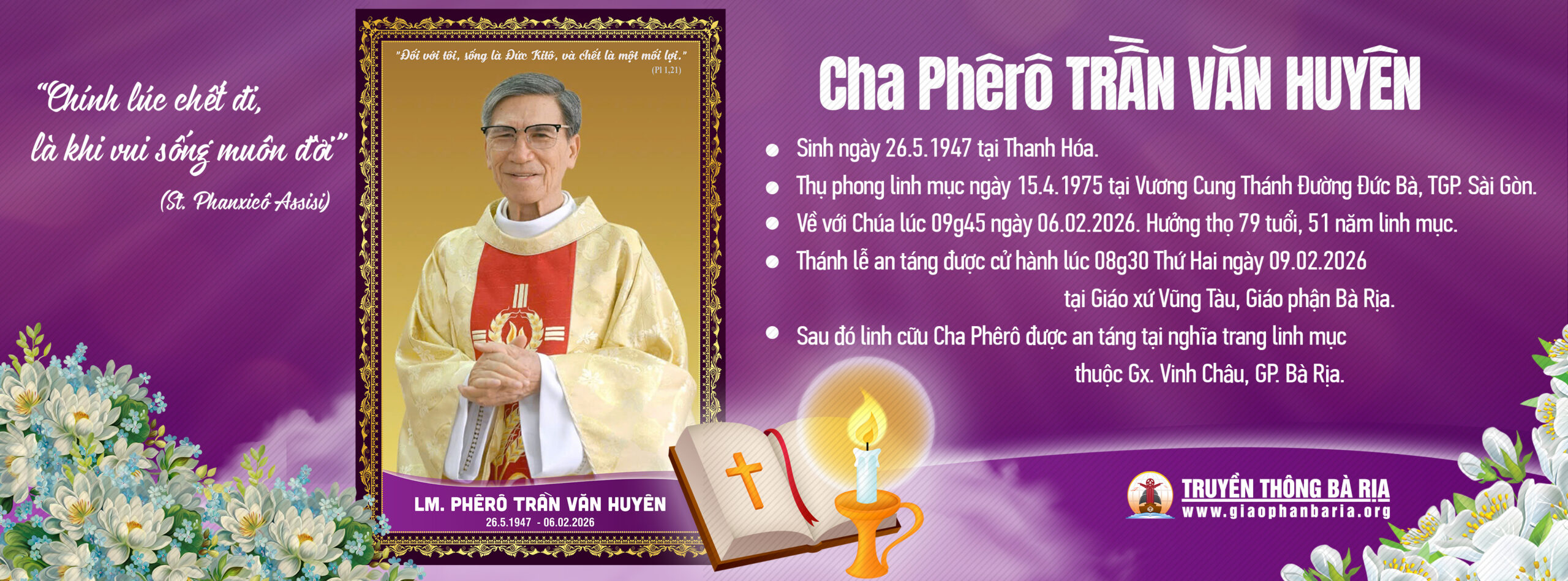 Vào lúc 08g30 sáng Thứ Hai, ngày 09.02.2026, trong bầu khí trang nghiêm và thấm đượm niềm xúc động, cộng đoàn Dân Chúa đã quy tụ tại Nhà thờ Giáo xứ Vũng Tàu để hiệp dâng thánh lễ an táng Cha cố Phêrô Trần Văn Huyên, nguyên Chánh xứ Vũng Tàu. Cha cố đã được Chúa gọi về ngày 06.02.2026, khép lại hành trình 79 năm dương thế, trong đó có 51 năm trung tín thi hành thừa tác vụ linh mục.