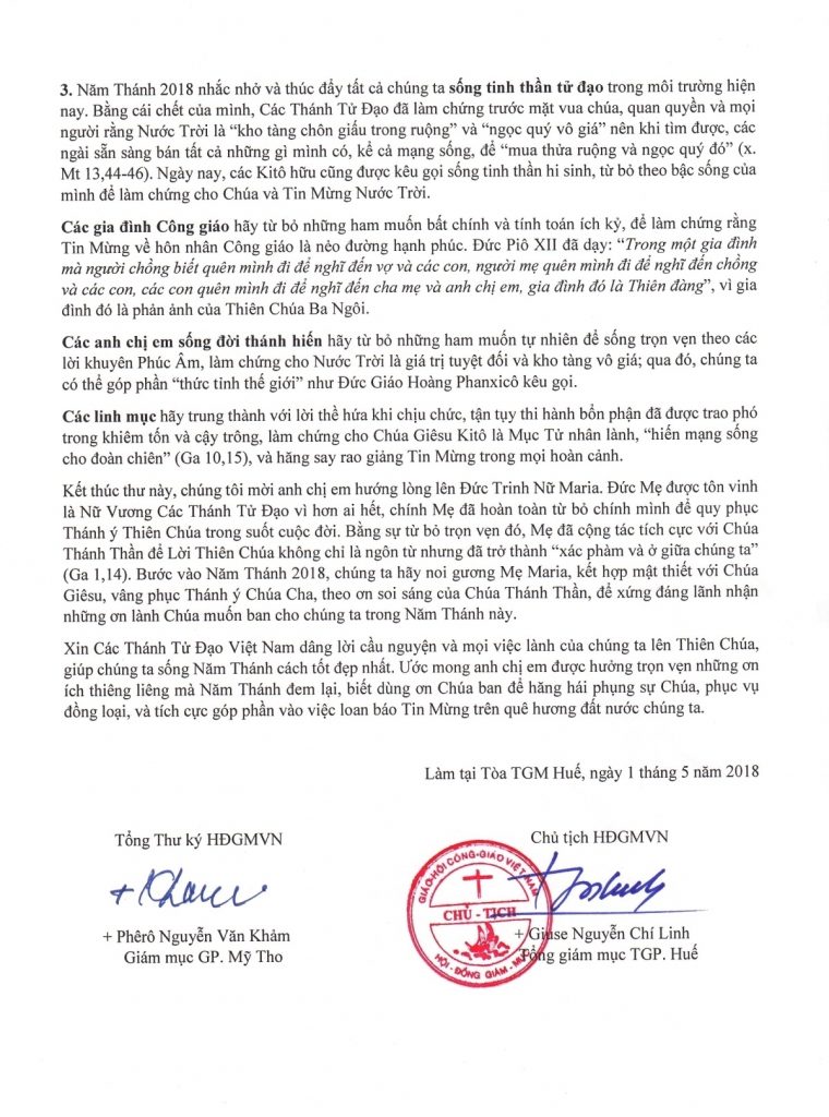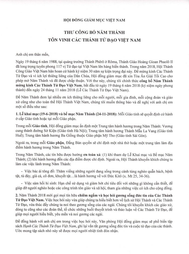 Thư công bố Năm thánh Tôn vinh các Thánh Tử đạo Việt Nam